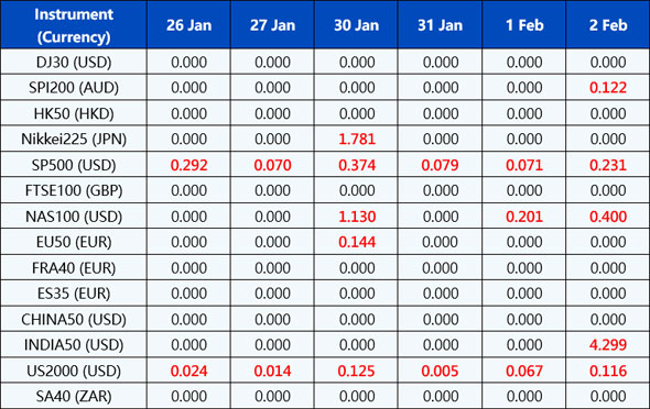 Please be advised that the dividends of the following index CFDs will be adjusted by upcoming ex-dividend dates. The comment for trading index CFDs will be in the following format “Div&<Product Name>&<Net Volume>” which show in the balance after the close of the day before the dividend payment date.