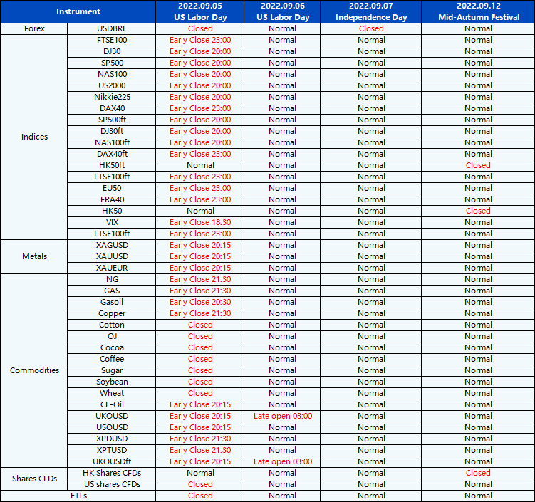 Please be advised that the following instruments’ trading hours and market session times will be affected by the upcoming September holidays.