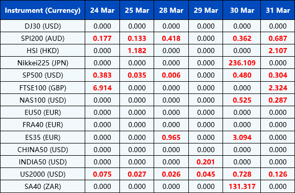 Please be advised that the dividends of the following index CFDs will be adjusted by upcoming ex-dividend dates. The comment for trading index CFDs will be in the following format “Div&<Product Name>&<Net Volume>” which show in the balance after the close of the day before the dividend payment date.