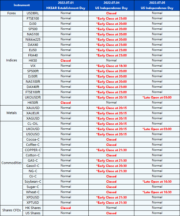 Please be advised that the following instruments’ trading hours and market session times will be affected by the upcoming July holidays.