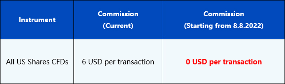 Please be advised that t the commission of all US Share CFDs products will be decreased to 0 USD per transaction starting from 8th August 2022 to further optimise the competitiveness and improve the trading environment.