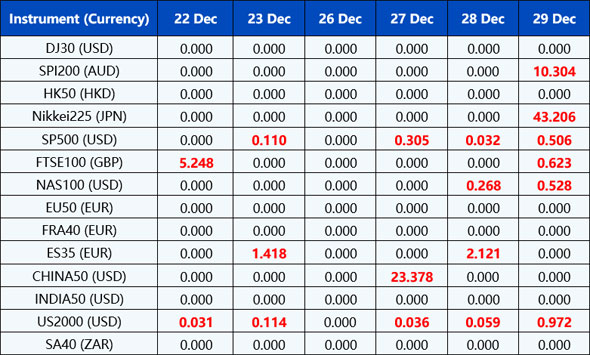 Please be advised that the dividends of the following index CFDs will be adjusted by upcoming ex-dividend dates. The comment for trading index CFDs will be in the following format “Div&<Product Name>&<Net Volume>” which show in the balance after the close of the day before the dividend payment date.