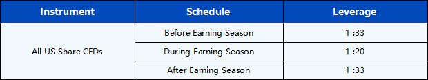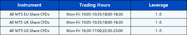 During these specific trading hours, MT5 Shares CFDs products leverage is fixed at 1:5 and additional margin is required to open any new positions. Once new holding positions are no longer within the specified trading hours, the leverage will automatically restore to 1:20.